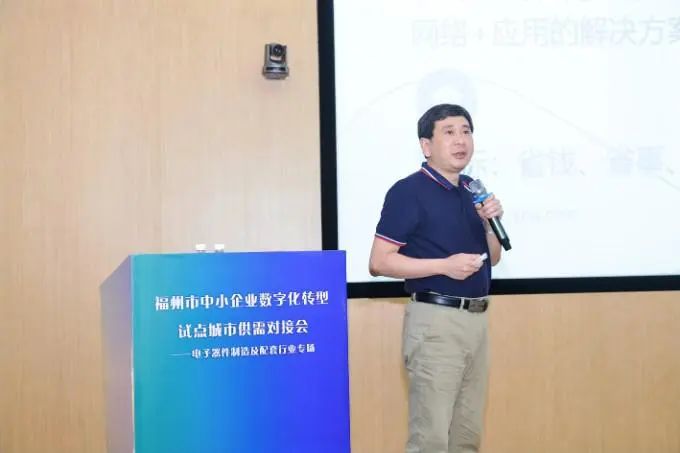 星网锐捷通讯事业本部光通信高级市场经理金海翔应邀在会上就如何通过“专线+应用”,助力中小微企业数字化转型相关内容进行分享。此外,会议还邀请了中国工业互联网研究院研究员对中小企业数字化水平评测指标进行深入解读,同时邀请了行业内优秀被改造企业上台,分享在改造过程中的难点痛点和成功经验,中国移动通信集团福建有限公司福州分公司就电子器件制造及配套行业进行数字化转型主题分享,为参会企业提供建议和指导。