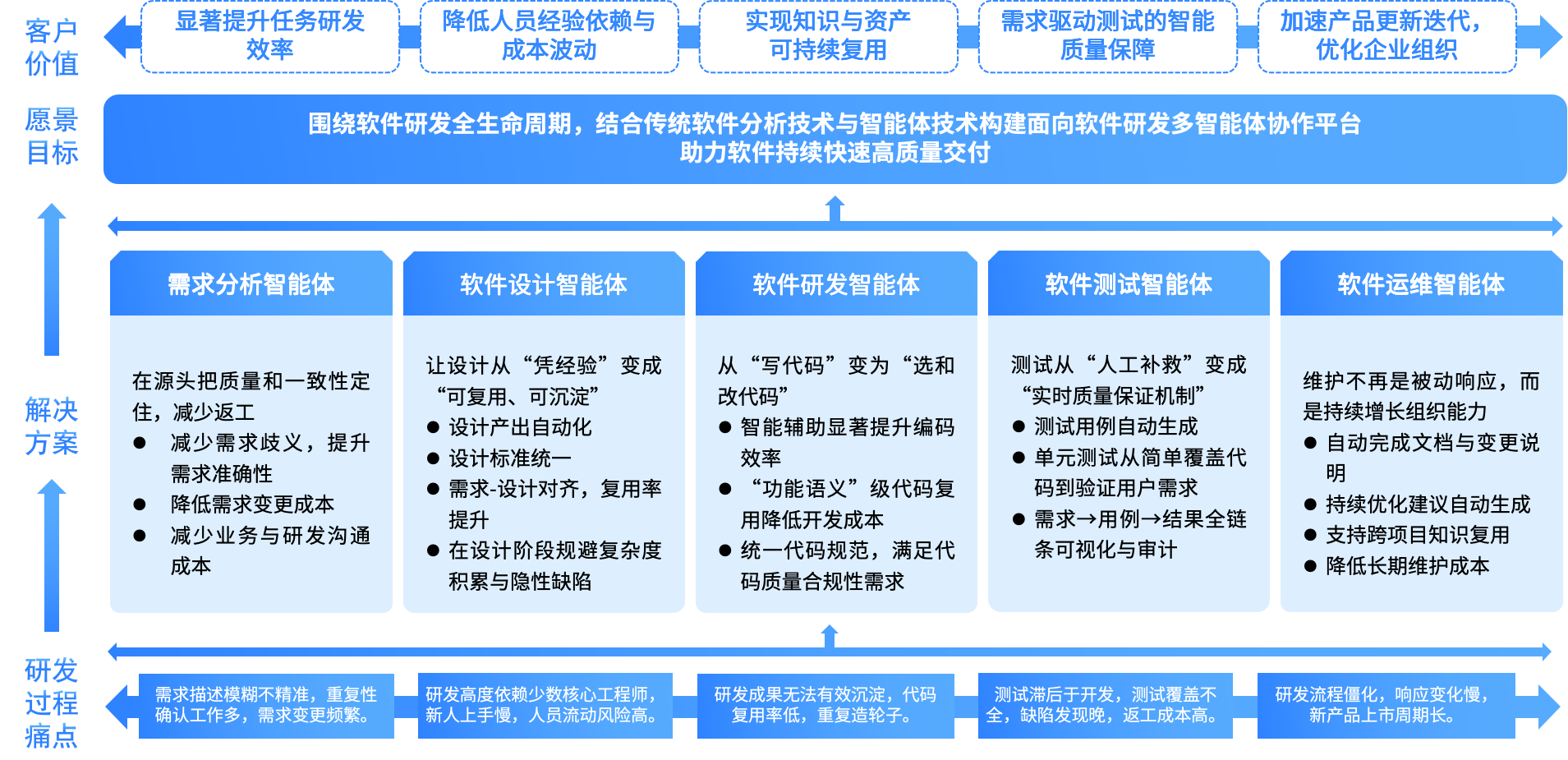 围绕软件研发全生命周期,结合传统软件分析技术与智能体技术构建面向软件研发多智能体协作平台,助力软件持续快速高质量交付。